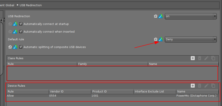 Set USB Redirection to "on" and set the Default rule to "Deny".