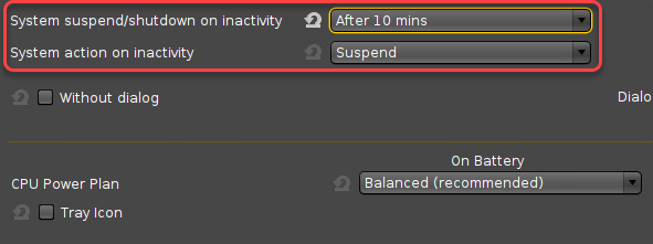 ->To configure suspend or shutdown on inactivity, go to System > Power Options > System and set the following parameters according to your needs: