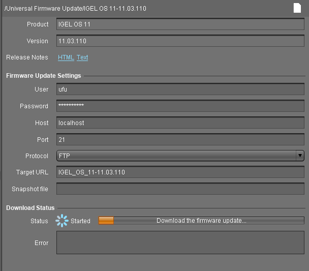 The firmware is transferred to the FTP server. In the main window, you can monitor the download process.