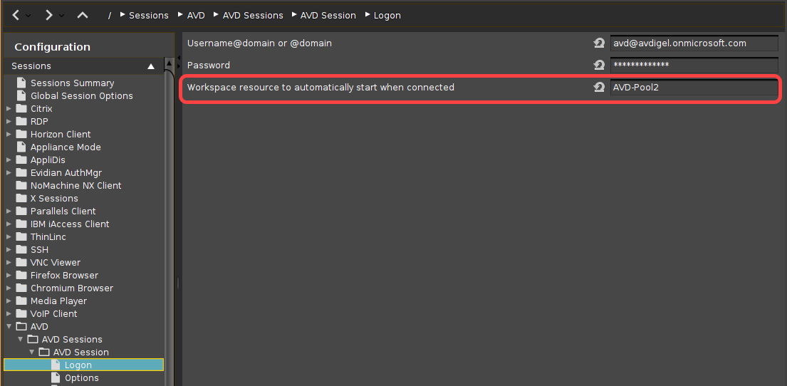If the login is to be started automatically on session startup, go to Sessions > AVD > AVD Sessions > [Session name] > Logon and enter your credentials under Username@domain or @domain and Password. For details, see Logon 1.