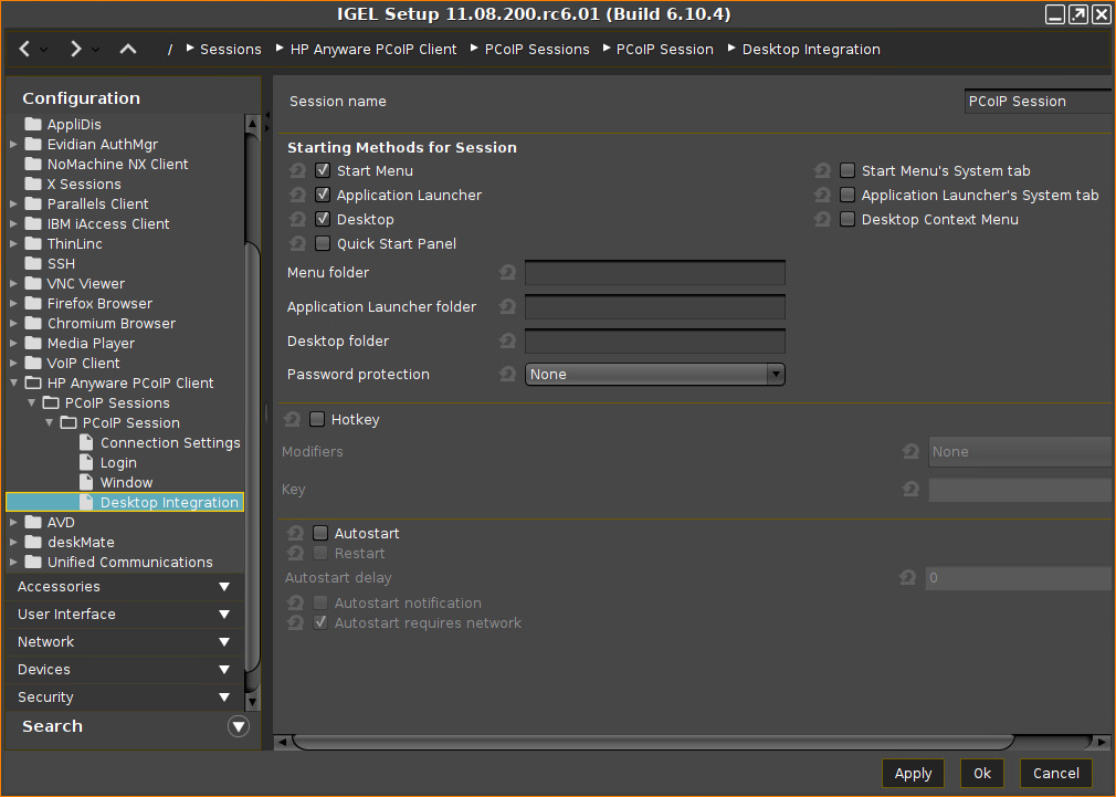 Application Launcher folder: If you specify a folder name or a path comprising a number of folder names separated by "/", a menu path will be created for the session. The menu path will be used in the Application Launcher.