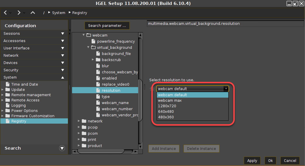 → Go to System > Registry > multimedia > webcam > virtual_background > resolution and choose from the possible options: