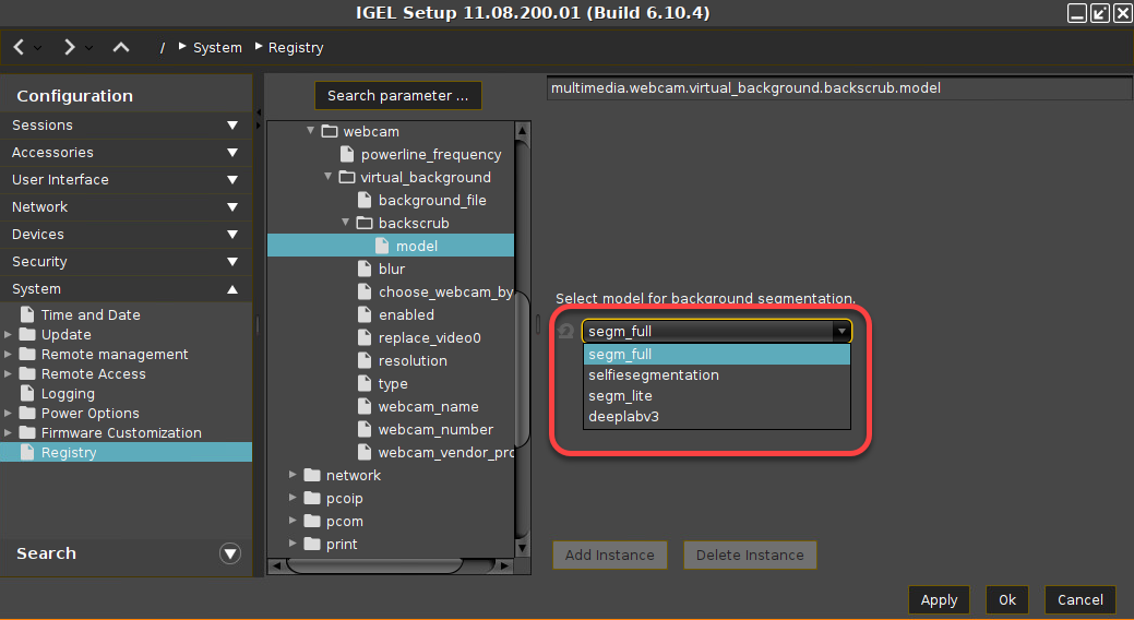 → Go to System > Registry > multimedia > webcam > virtual_background > backscrub > model and choose from the possible options: