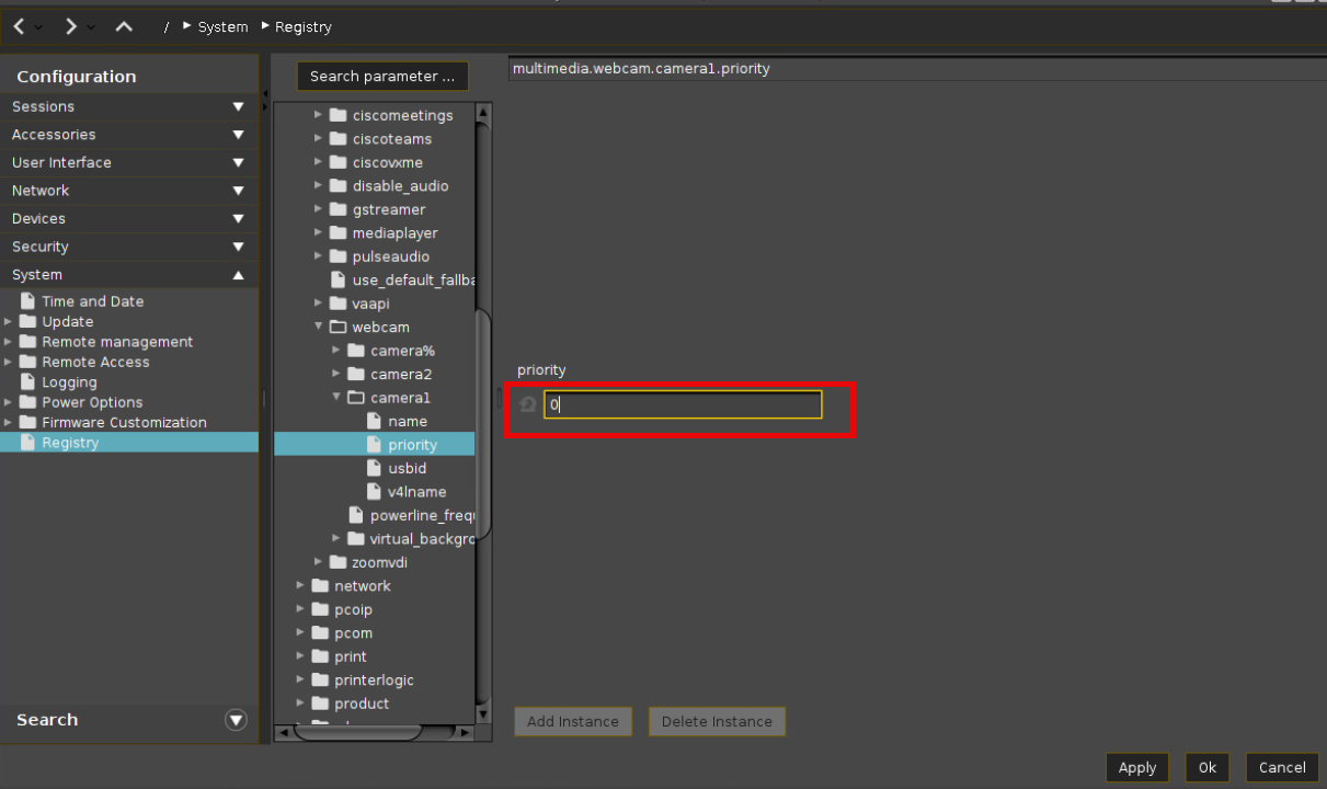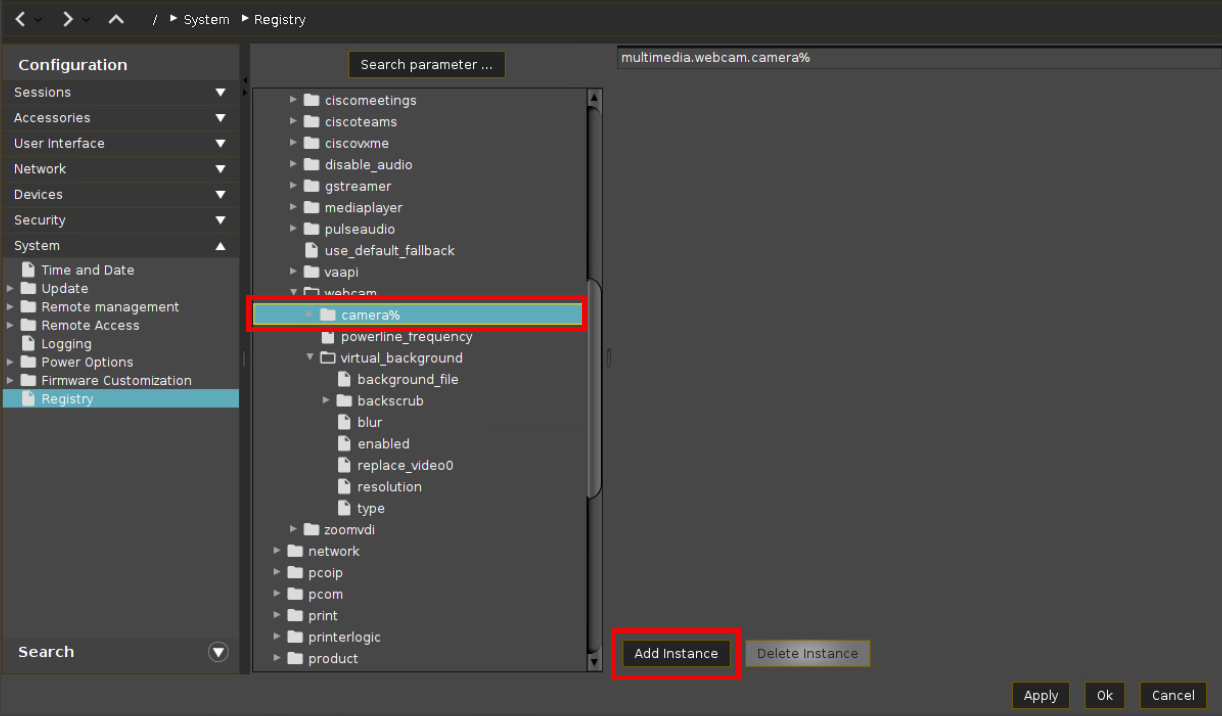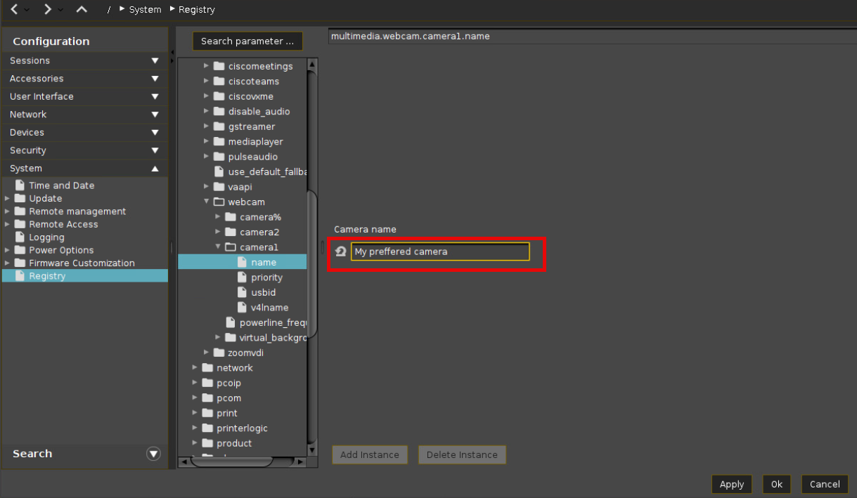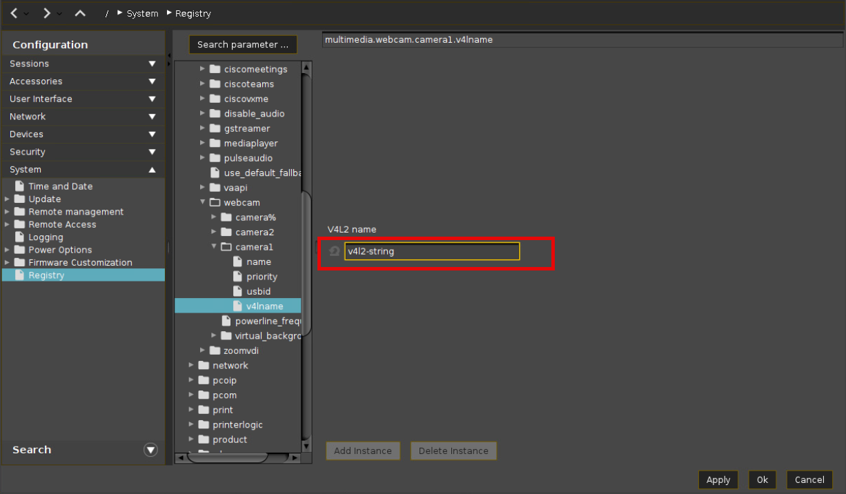 Select the created instance and set System > Registry > multimedia > webcam > [camera instance] > v4lname to the name of the desired webcam. To get the V4L2 webcam name, you can use the command