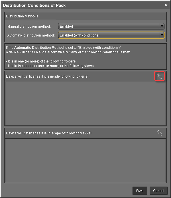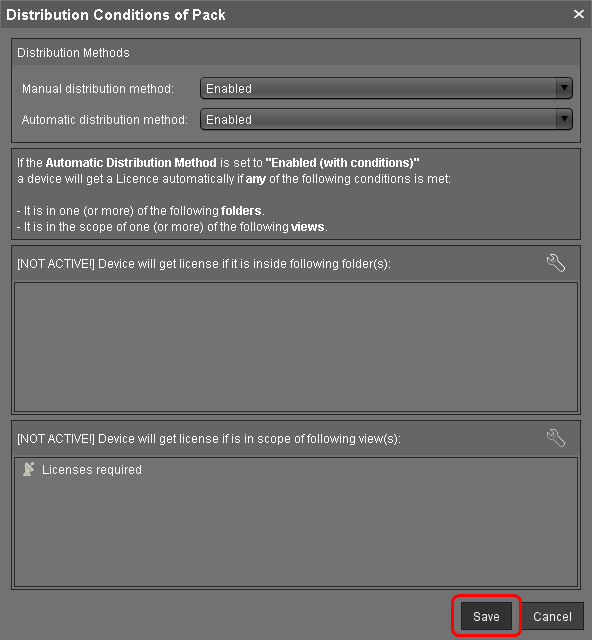You can configure the distribution conditions per Product Pack. This allows you, for instance, to distribute licenses from an Enterprise Management Pack (EMP) only to devices that are located in a specific directory of the UMS structure tree.
