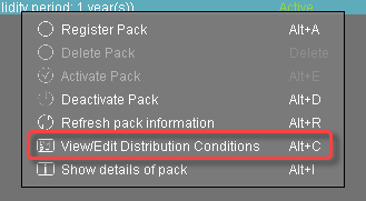 In the area UMS Administration > Global Configuration > Licenses > Deployment > Registered packs, open the context menu of the Product Pack pack in question and select View/Edit Distribution Conditions.