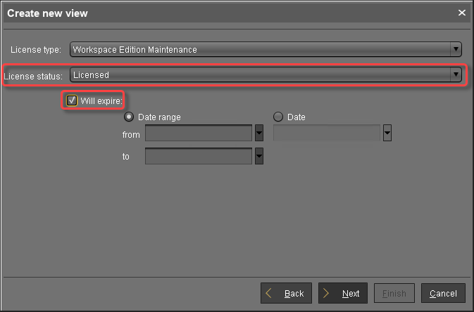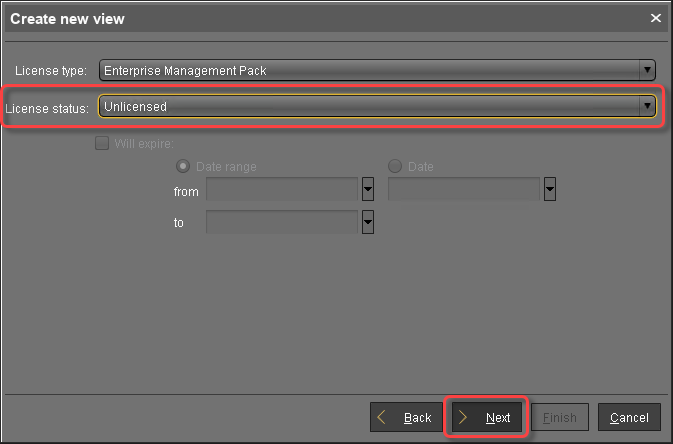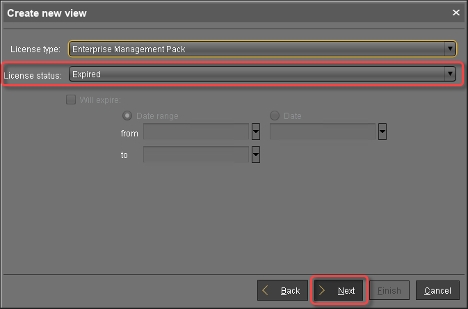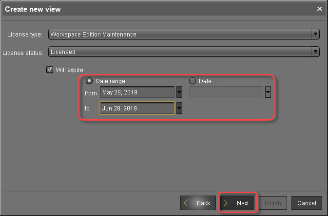 Select a Date range or a Date for the license expiry you want to detect; then, click Next.