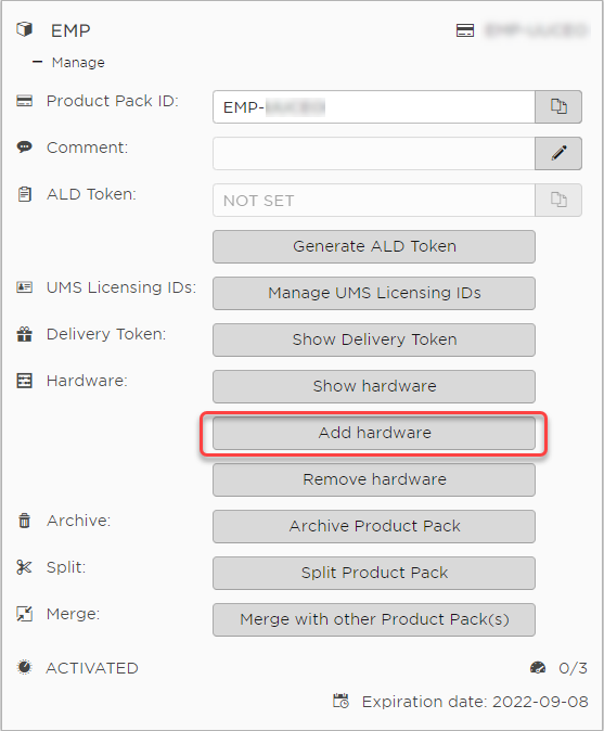The order details are shown.Open the management dialog for your Product Pack.
