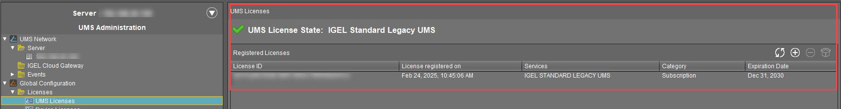 Add the license file in the UMS Administrator by clicking Activate new UMS license under Settings. For details, see Settings - Change Server Settings in the IGEL UMS Administrator .