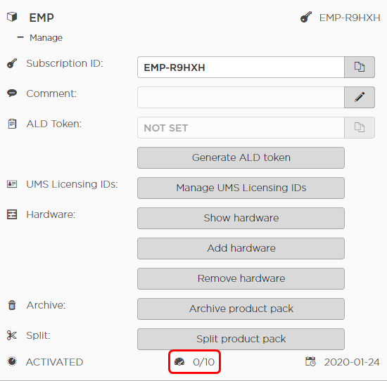 The license count of the Product Pack is increased by 1. The license is now assigned to the new device.