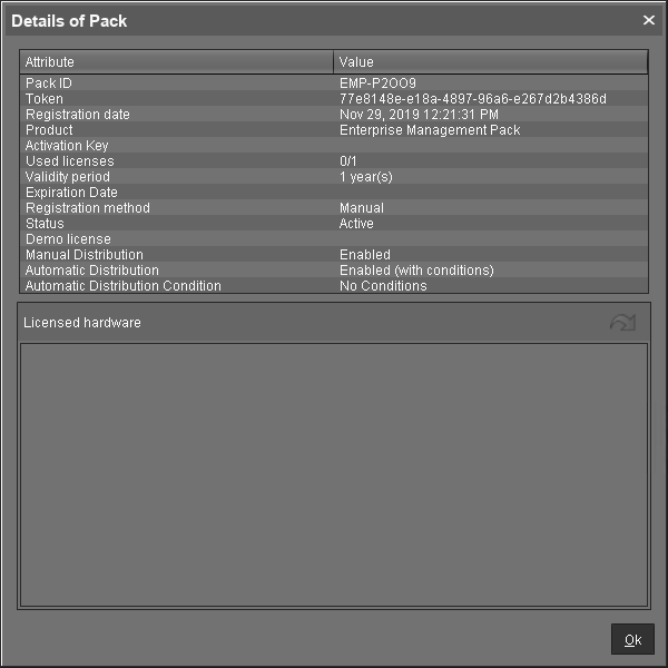 The dialog Details of Pack shows the license information: