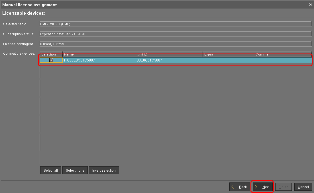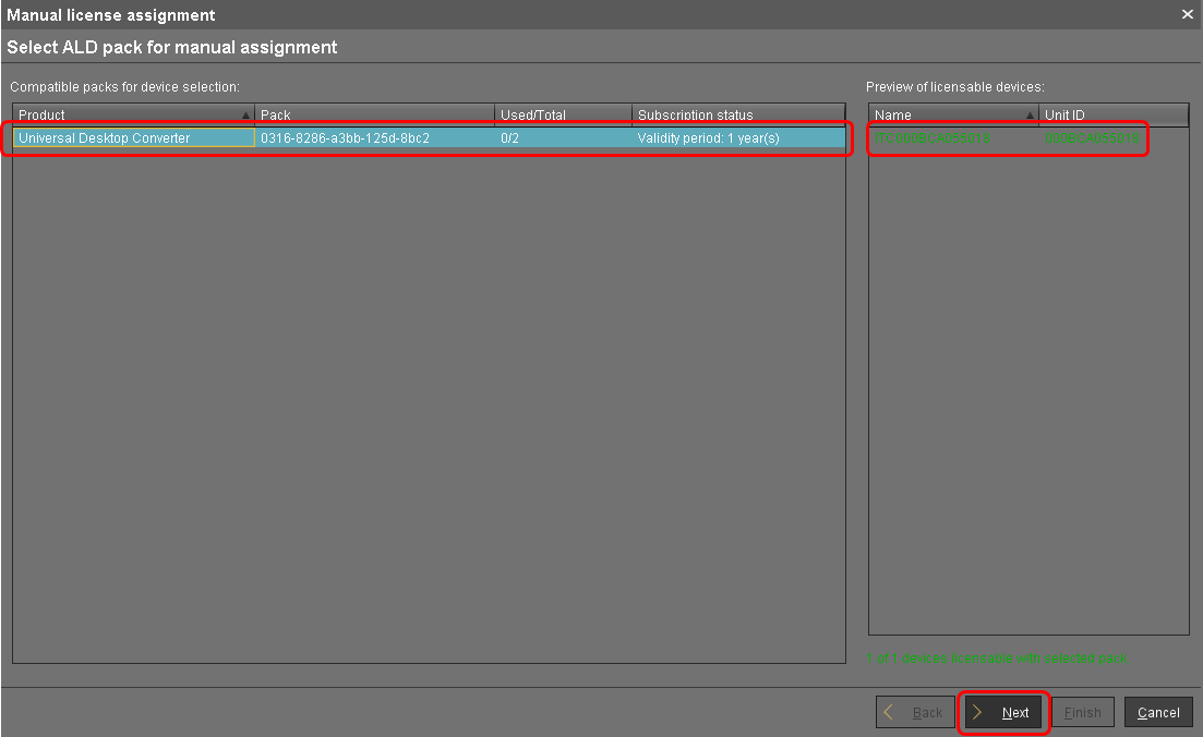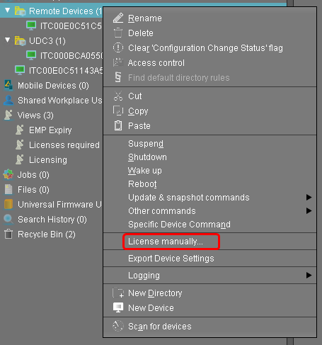 The UMS provides a wizard that you can use to trigger license assignments manually. This assignment method requires free license slots of the appropriate type to be available in the UMS. It gives you fine-grained control over when licenses are assigned. It also offers an alternative way of selecting the devices to which the licenses are to be assigned.