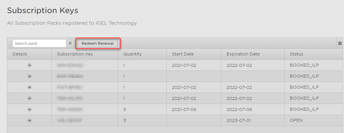 The selected Product Packs are renewed. The Product Packs that were associated with the same Subscription Key but have not been renewed are decoupled from the Subscription Key. As long as they have not reached their expiration date, they can be still used. But it is not possible to assign them back to the Subscription Key or renew them. On the Product Packs page, you can identify these Product Packs by the missing Subscription Key: