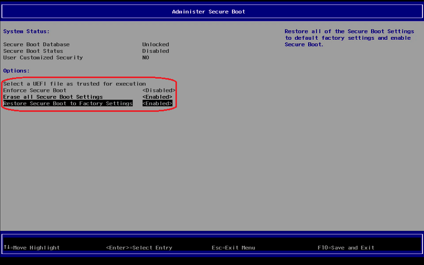 Erase all Secure Boot Settings and Restore Secure Boot to Factory Settings are now set to <Enabled>.