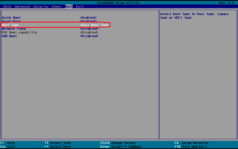 Using the arrow keys, move to the Boot tab. You will find Boot Type set to <Dual Boot Type>.