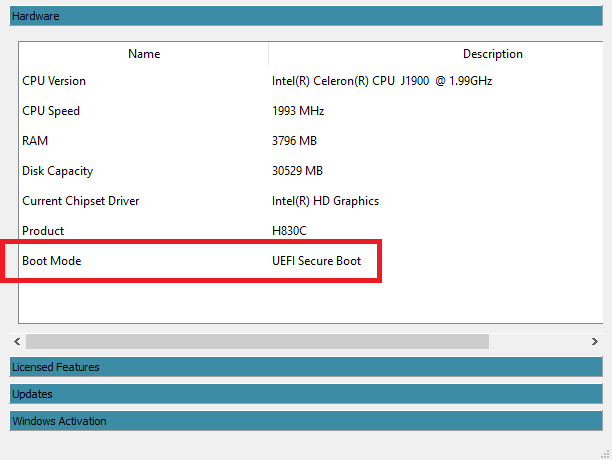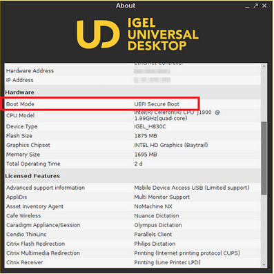 In the IGEL Device Information tool, in the Hardware tab, Boot Mode is set to the value UEFI Secure Boot.