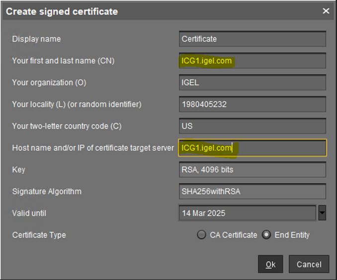 Create the certificate. For details, see How to Use Your Own Certificates for Communication over the Web Port (Default: 8443) in IGEL UMS . For general information on web certificates, see Web Certificates in the IGEL UMS .