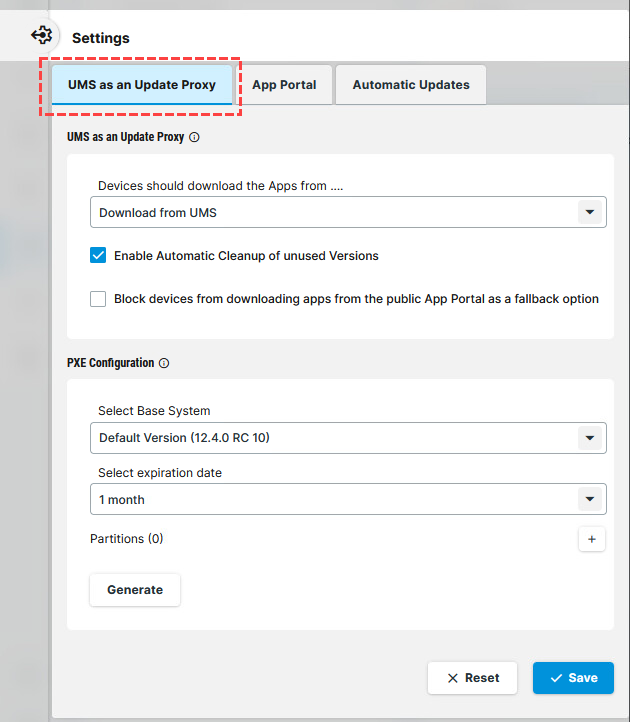 ☑ The UMS App Proxy does an automatic cleanup of the local cache once a week to keep the disc space used small. The cleanup checks all app versions in the cache against the app versions loaded in UMS. App versions which are used are excluded from the cleanup, for all others the binary files in the cache are deleted. The metadata of the apps in UMS is not changed.