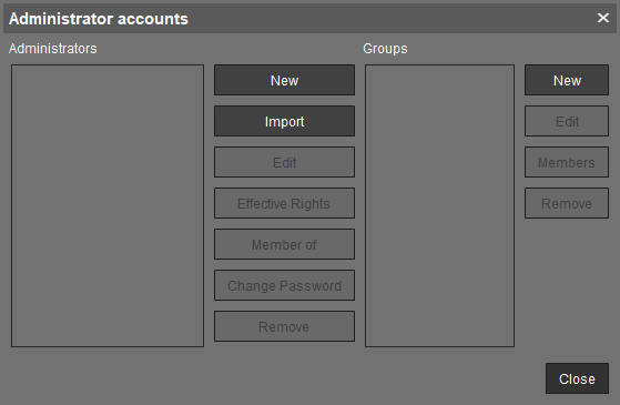 ☑ The management of permissions can be performed: administrators and groups, as well as their rights, can be added and edited.
