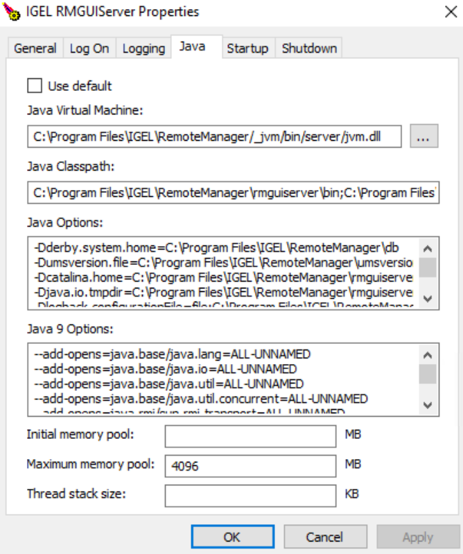 In UMS 12.02.100, Java was updated from version 8 to 17. For the migration, we had to add additional Java options for UMS Console, UMS Administrator and IGELRMGUIServer. These options look like this:
