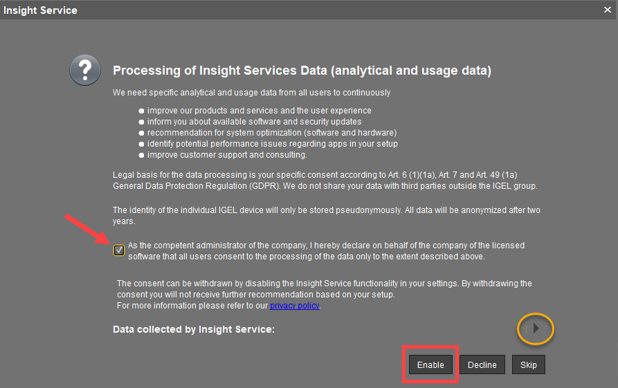 ☑ Enables IGEL Insight Service if you accept the privacy policy in the dialog opened and click Enable. When you activate the IGEL Insight Service, IGEL collects specific analytical and usage data; see IGEL Insight Service .