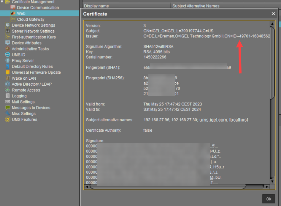 Use subject alternative names (SAN) if the IP addresses or hostnames that are used for the UMS and your load balancer / reverse proxy are different. For information on hostnames, Cluster Address, FQDNs, see also Troubleshooting: Error 38 during the Onboarding of an IGEL OS 12 Device .