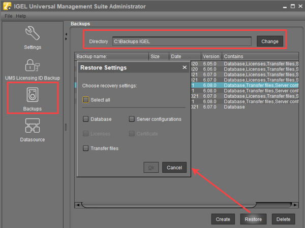 When a backup is restored, your current database status will be overwritten. It is strongly recommended that you create a backup of the current data before another backup is restored, see Creating a Backup of the IGEL UMS.