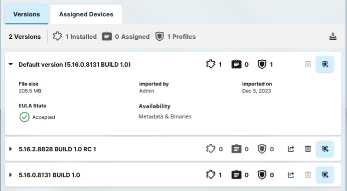 Shows information on all available versions of the app, e.g. if and how an app version is used (installed, assigned, used in profiles).