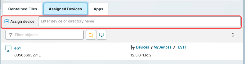 To quickly assign a profile to a device / device directory, you can use the Assign device function under Configuration > [name of the profile] > Assigned Devices. To use this option, you should already know the name of the device / device directory or its part.