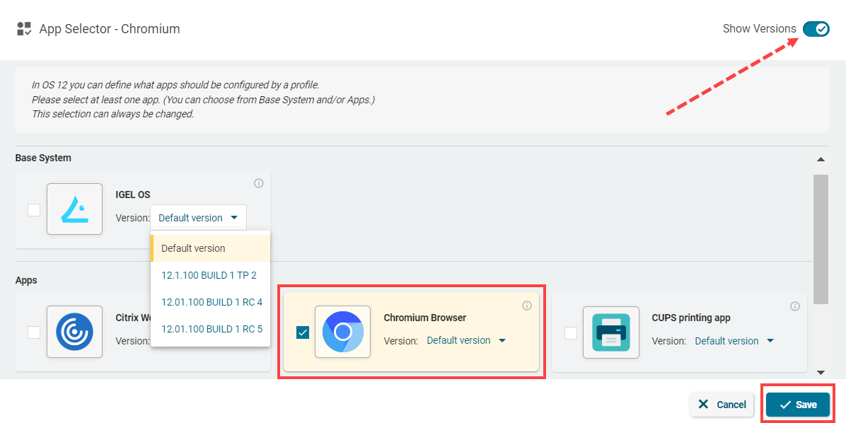 In the App Selector, select the app(s) you want to configure. It is ALWAYS necessary to select at least one app when creating a profile for IGEL OS 12 devices.