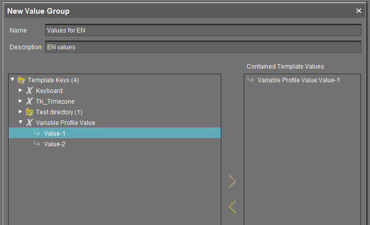 If for example you have various profiles which are to receive country-specific settings via template keys and value assignments, all values for a country / a language can be grouped in a value group. When such a group is assigned, a device also receives all values for its country / its language contained in it.