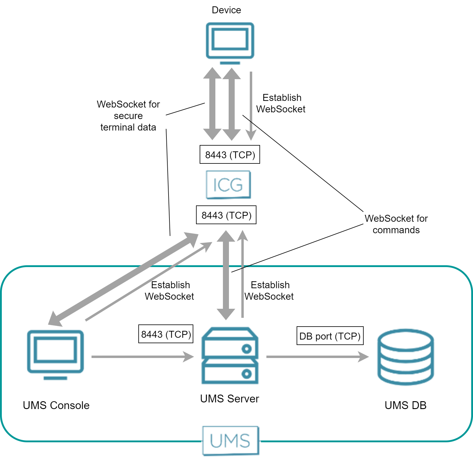 • Unified Protocol WebSocket connections are initiated between the UMS Server and the ICG and between the Device and the ICG