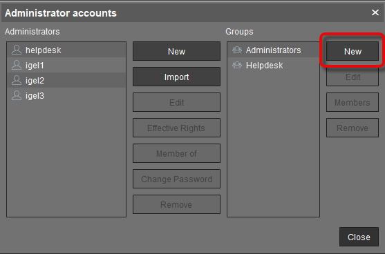 In the UMS Console, go to System > Administrator accounts and click New to create a new user group.