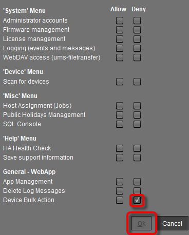 For this user group, set the Device Bulk Action permission to Deny. Do not set any other permissions for this group.