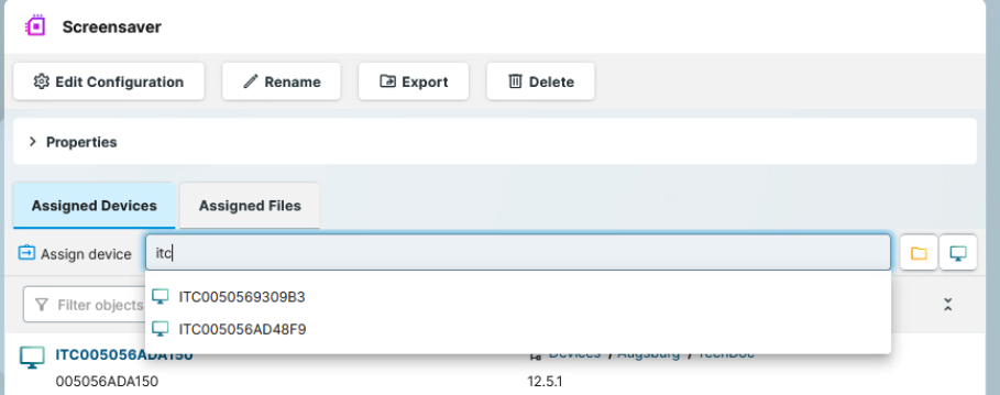 Assigned Devices | Shows all the devices the selected file is assigned to. → To quickly assign the file to a device or a device directory, enter the name of the device or device directory and click the name in the list. For details, see Upload and Assign Files in the IGEL UMS Web App. → You can filter the devices / device directories assigned. The filter criteria are linked with the operator AND. Click → Detach the selected device / device directory by clicking → Click the name of the device in the list to jump to the corresponding device and see all Assigned Objects for it. → Click the name of the directory to jump to the corresponding device directory and see all Assigned Objects for it. | |