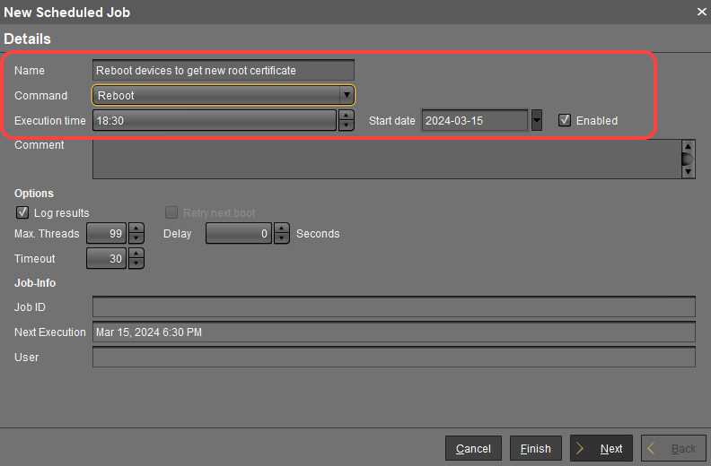 To restart all affected devices at a defined time, it makes sense to create a scheduled job.Go to Jobs, open the context menu, and select New Scheduled Job.