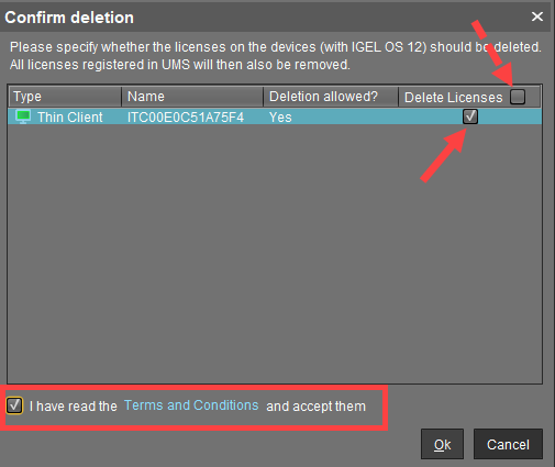 For IGEL OS 12 devices only: In the Confirm deletion dialog, specify whether the licenses should be deleted and accept the Terms and Conditions.