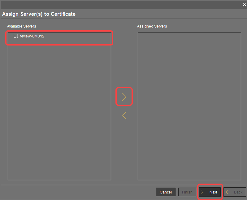 or select Assign server in the context menu.In the dialog Assign Servers(s) to Certificate, assign the required server(s) and click Next.