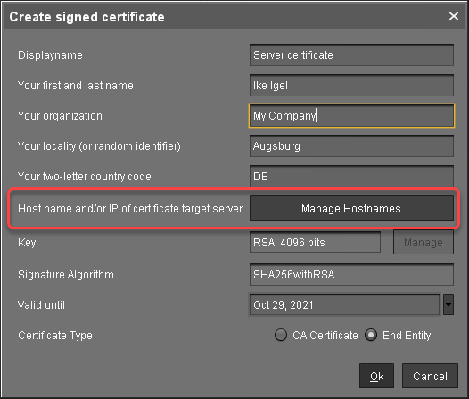 In the dialog Set Hostnames for Certificate, adjust the settings as follows: