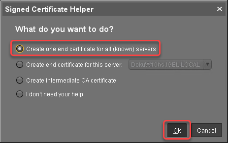 In the Signed Certificate Helper, select Create one end certificate for all (known) servers.