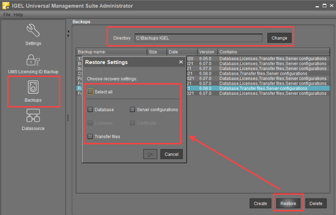 Under UMS Administrator > Backups, select the folder with your backup and restore the respective backup file with all options. Wait until the UMS Server fully starts, i.e. the UMS Console can connect with it.