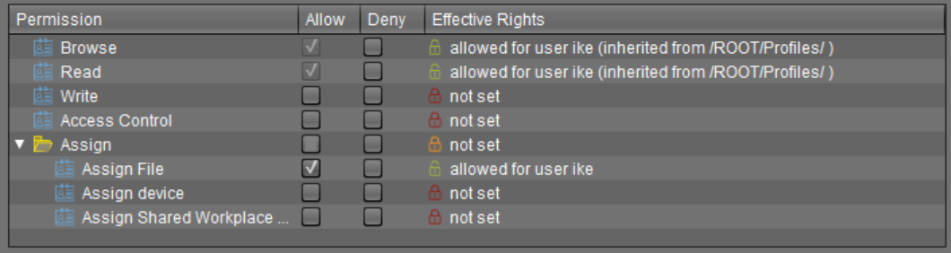 A user can only assign a file to a profile or delete this assignment. He cannot make any changes to the file or profile, i.e. he cannot edit, rename, or delete them.