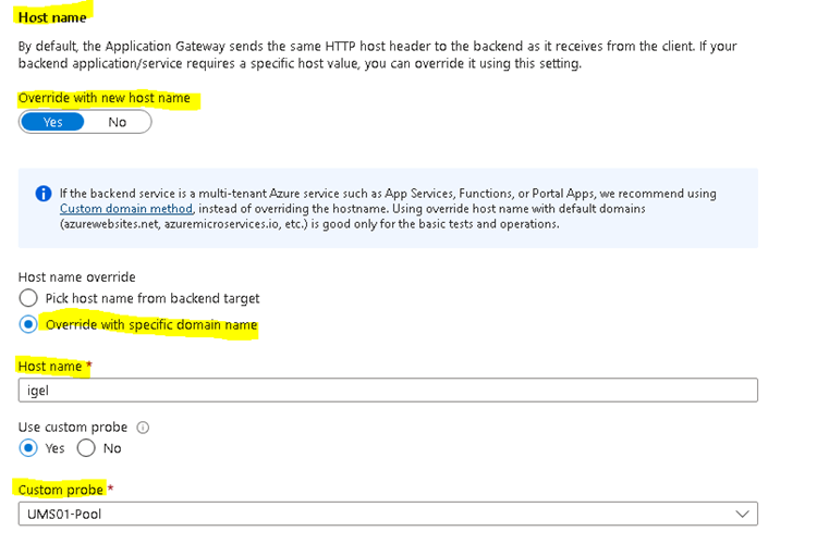 In case the Common name cannot be adjusted, it is possible to adopt the Hostname of the UMS / ICG in the Backend Settings. In this case a custom probe must be defined with the given Host name value.