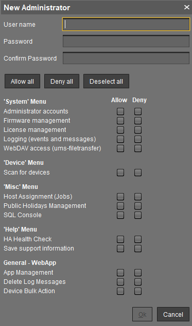 Below, you will find a list of permissions that can be given to individual administrators or groups under System > Administrator accounts > New or Edit. Each permission has three possible states: not set, Allow or Deny.