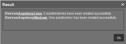 A window showing the result of the import will appear. Any newly created directories will be underlined.