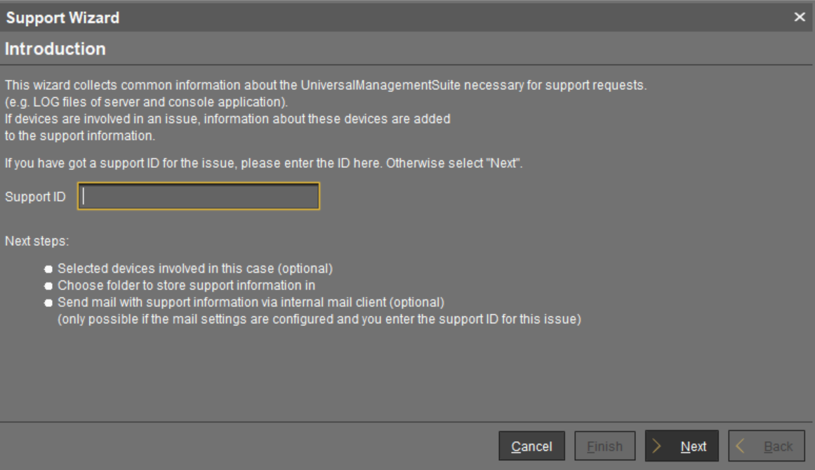 In order to send log files using the Support Wizard, the mail settings must be correct; further information can be found under Mail Settings . The support ID must also be valid.