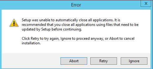 When updating the High Availability (HA) installation, an error message appears saying that not all applications could be closed before the update. A retry does not solve the problem.