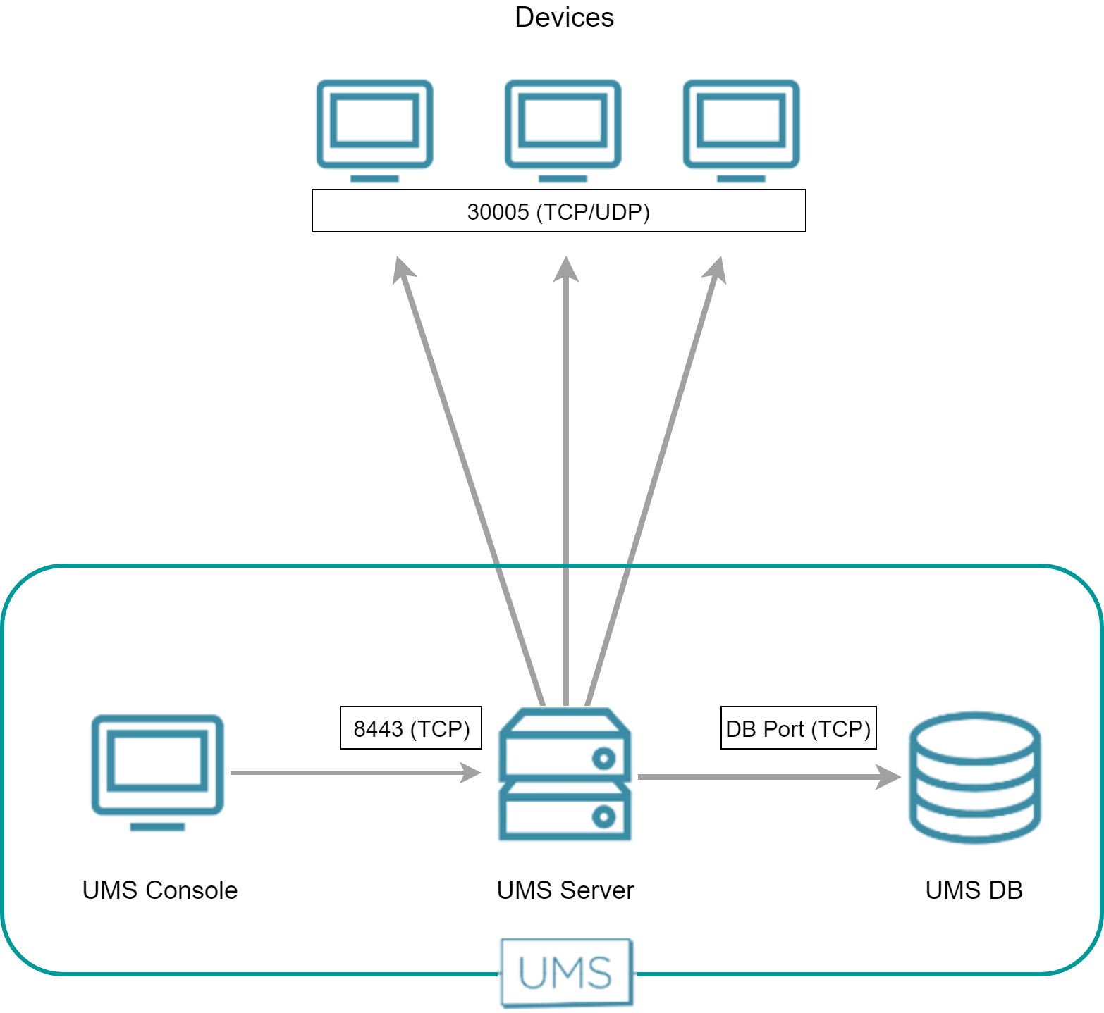 The following figure illustrates the communication between the UMS and the devices:
