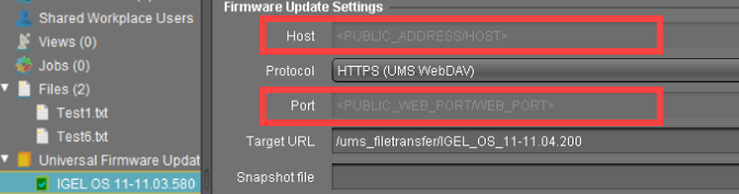 Since the connection information is dynamically adjusted, Host and Port data are not editable for the downloaded firmware update (with the HTTP(S) (UMS WebDAV) protocol set):