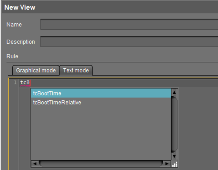 Text mode allows entering a rule in an SQL-like query, consisting of one or more expressions, see Queries in Text Mode of Views: Expression Parts below.